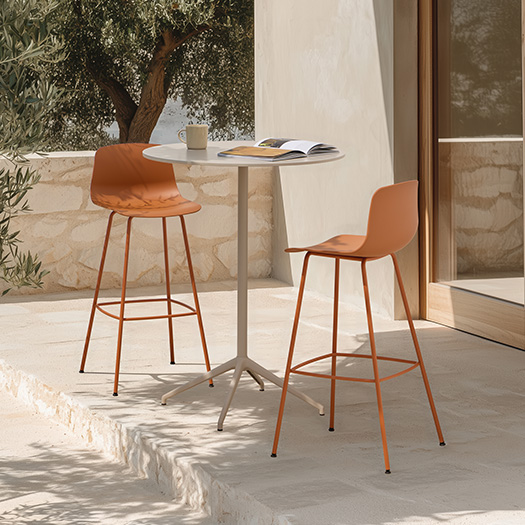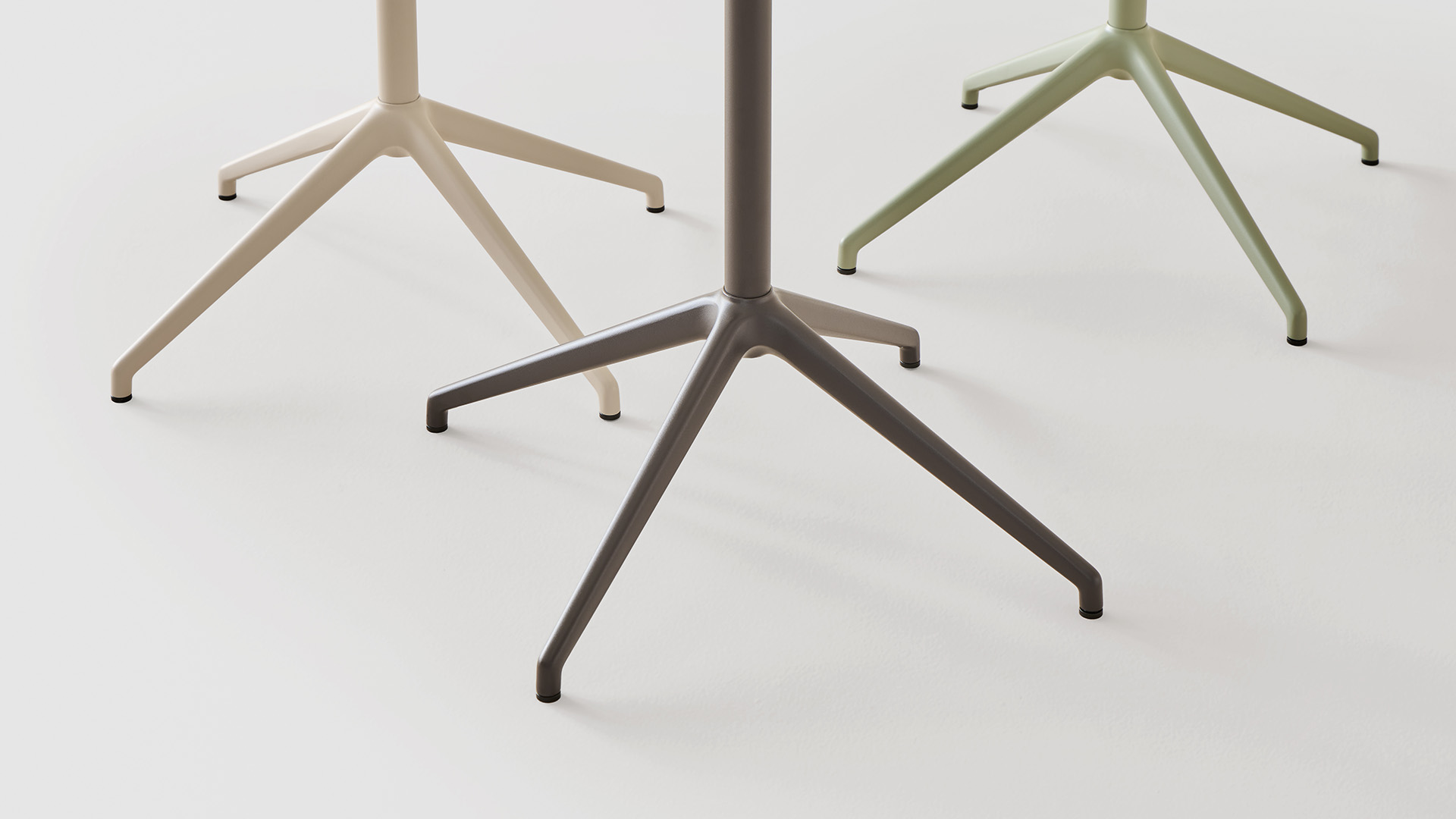 The BARLIS tables are characterized by their lightweight four-spoke aluminum base available in 3 heights and in a wide range of colours. The bases can be combined with round and square tops available in all the top materials and colours of our top range. There are versions with fixed or flip tops. The tables with HPL tops are also suitable for outdoor use.