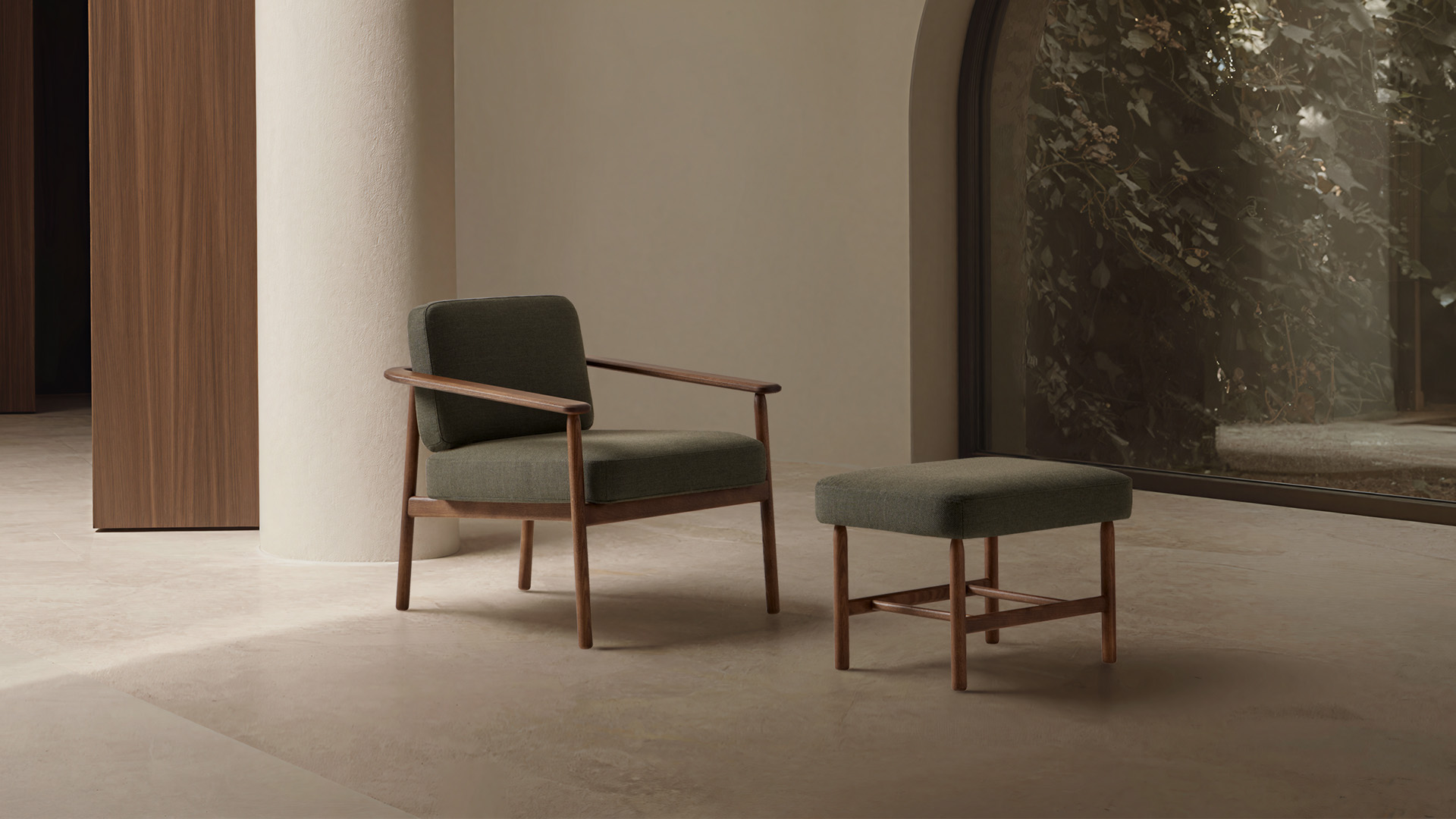 Wudi is a collection of armchairs, benches and side tables for lounge areas that combine tradition and modernity through the use of wood. The armchair is a timeless and comfortable design, characterized by its expressive armrests. A backrest supported by a fabric stretched like a sail contributes to the light and relaxed spirit of the piece. The rounded solid wood structure radiates warmth and softens its image, while the upholstery and high-quality details lend it great elegance. The collection is completed with original upholstered benches and side tables that can be easily integrated into multiple spaces.