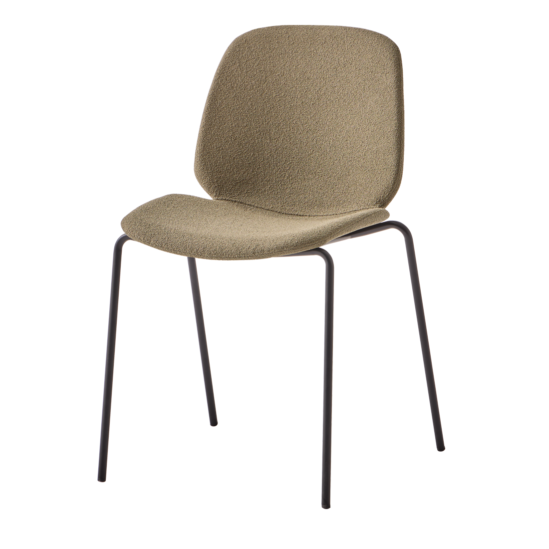On the image: chair with 4 leg frame and fully upholstered seat shell with standard upholstery.