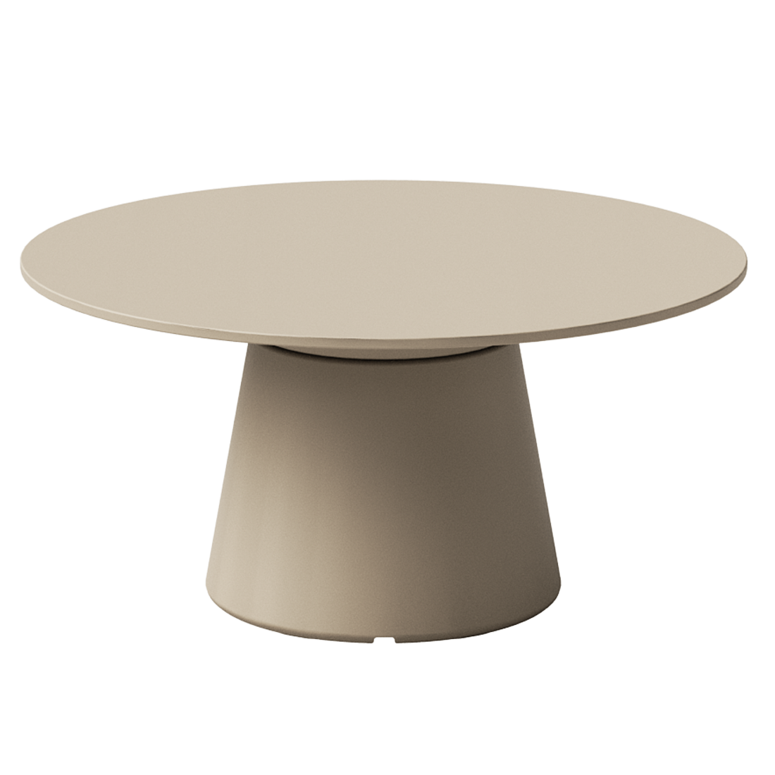 Versatile table with round central base and round or square top. The original central polyethylene base is available in a wide variety of standard and custom finishes. The base can be combined with tops of different materials and dimensions. The great variety of finishes and materials available allows to compose the table required in any context and space.