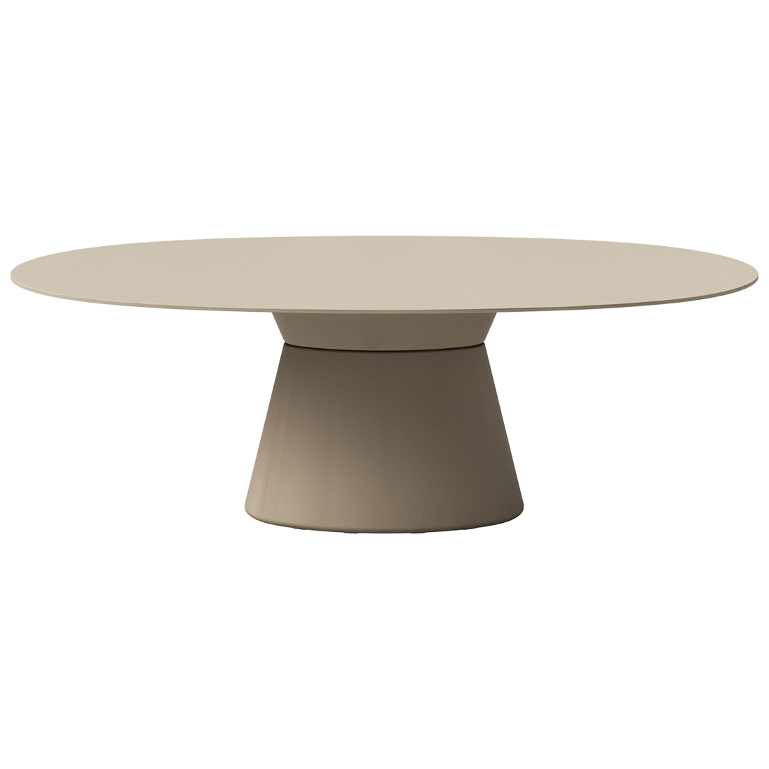 Versatile table with round central base and round or square top. The original central polyethylene base is available in a wide variety of standard and custom finishes. The base can be combined with tops of different materials and dimensions. The great variety of finishes and materials available allows to compose the table required in any context and space.